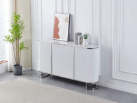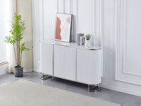 THE ESMEE SIDEBOARD IS A 4 DOOR MDF SIDEBOARD WITH A WHITE AND GREY MARBLE EFFECT CERAMIC TOP THAT IS STARCH AND HEAT RESISTANT FEATURING STAINLESS STEEL DETAILS AND MEASURING 180X40X100CM