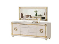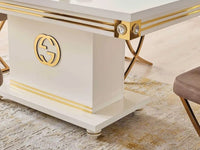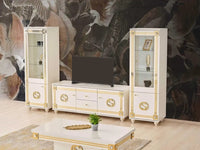 GUGI BEIGE AND GOLD LIVING ROOM SET 7 PEICES ( SIDEBOARD-195X47X78CM , MIRROR- 160X2X65CM , DISPLAY CABINET 2-1 DOOR 115X47X176 CM / 57X47X176CM ,DINNING TABLE-160X90X80CM , TV CABINET-160X47X62 CM , COFFEE TABLE 120X65X50CM )