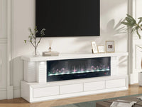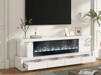 FLOMORA TV STAND WITH ELECTRIC FIREPLACE HEATER , 1500W, WITH REMOTE CONTROL , MULTICOLOR 3D FLAME EFFECT AND CHARGER WITH 4 DRAWERS MEASURING 180CM