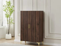 SHOE CABINET WALNUT WITH 2 DOORS ,MDF , STAINLESS STEEL BASE MEASURING 81X35X125CM.