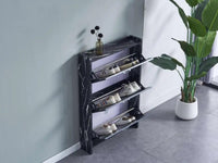 SHOE STAND SLIM , BLACK MARBLE PATTERNED WITH THREE TILTING DRAWERS MEASURING78X18X112CM
